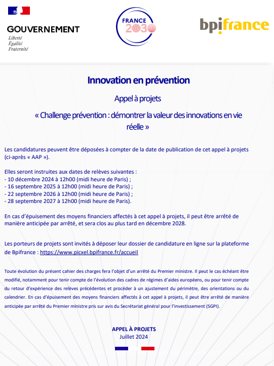 L’appel à projets « Challenge prévention : démontrer la valeur des innovations en vie réelle » doit permettre de soutenir des projets d’envergure autour d’objectifs de santé publique mettant en œuvre des dispositifs innovants dans le champ de la prévention, intégrant des technologies et produits de santé, pouvant faire intervenir des combinaisons d’innovations (techniques, biotechnologiques, numériques, organisationnelles ou interventionnelles).