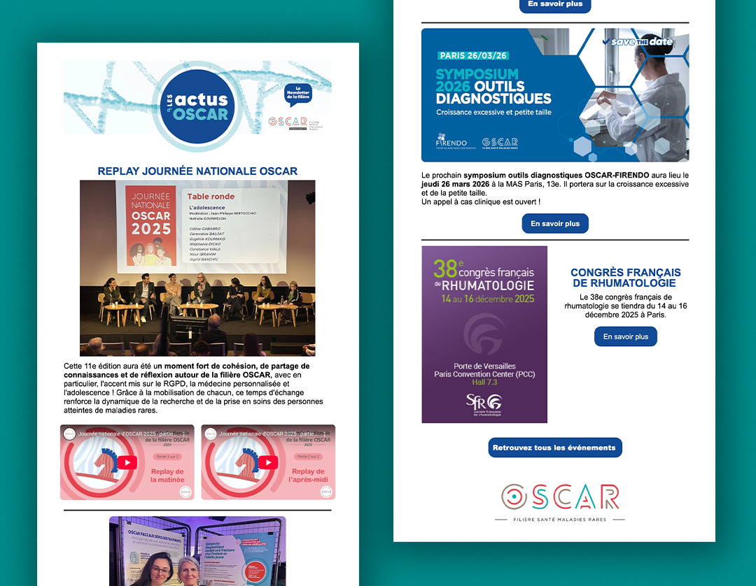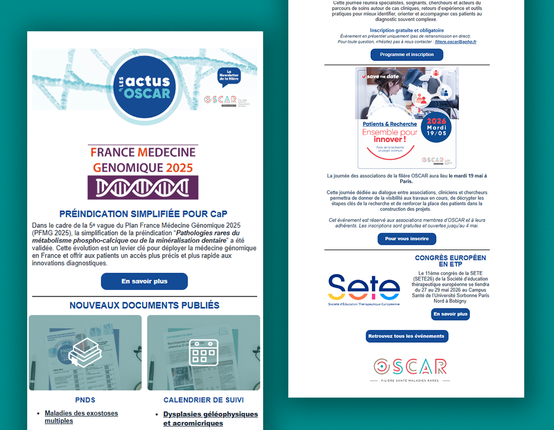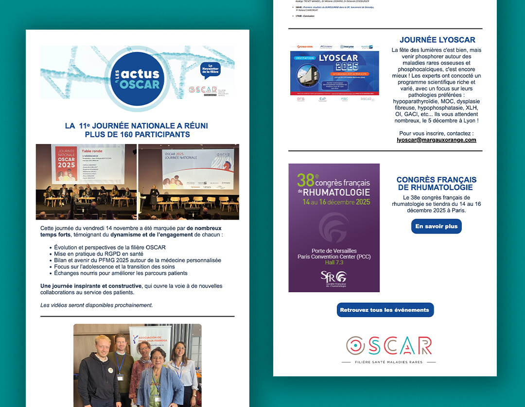 Abonnez-vous pour recevoir chaque mois l'actualité de la filière OSCAR et de ses partenaires, ainsi que la newsletter scientifique trimestrielle, avec des informations sur la recherche dans les maladies rares de l’os, du calcium et du cartilage, les essais cliniques en cours, les appels à projets, et plus encore.