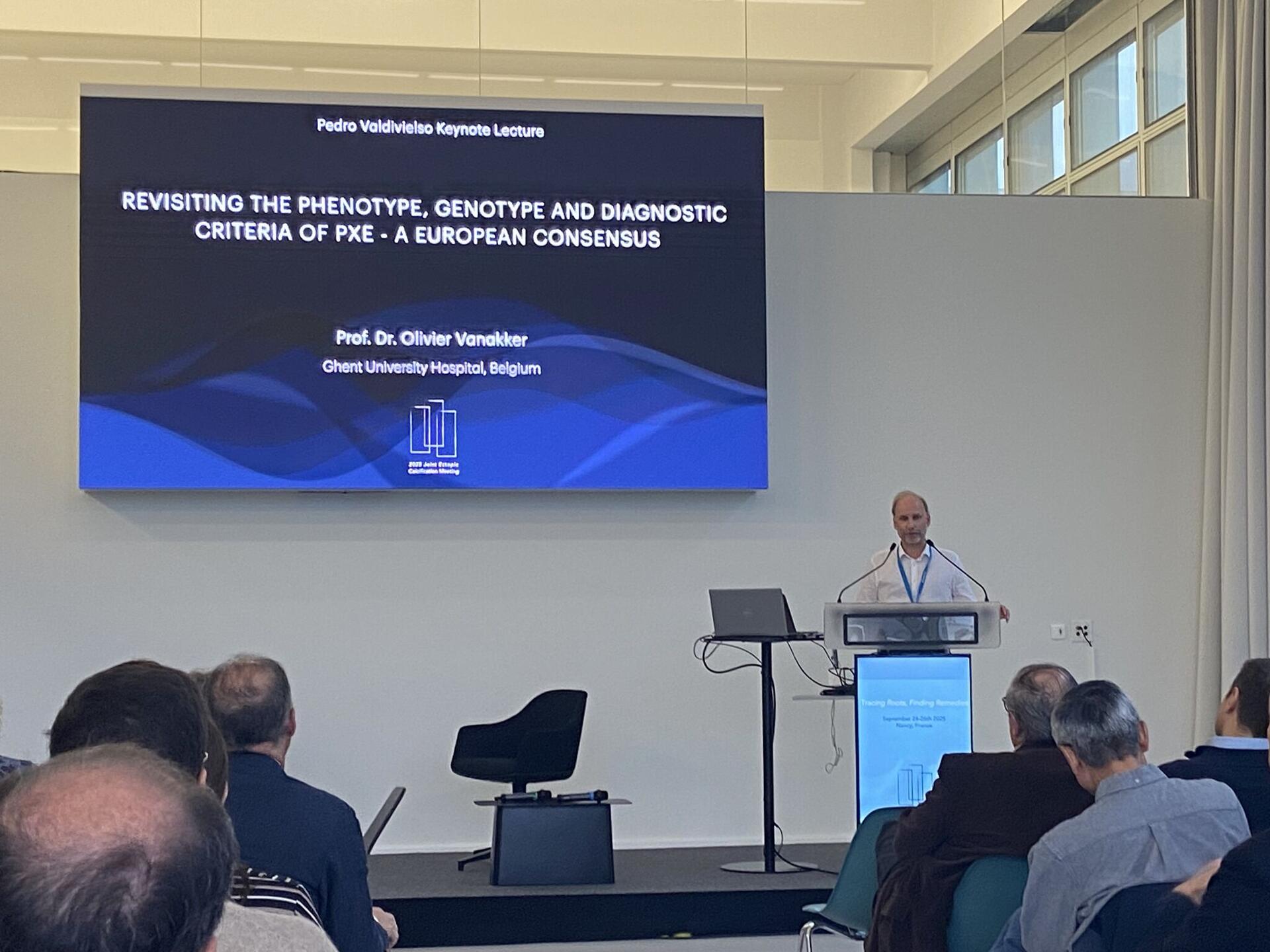 Superbe présentation d’Olivier VANAKKER, président de l’INTEC (Gand, Belgique), au nom du consortium REACT-PXE, qui a ouvert le meeting en proposant une mise à jour européenne des critères diagnostiques du pseudoxanthome élastique (PXE).
