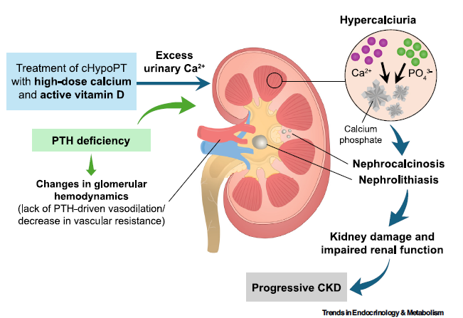 Le retentissement rénal n’est pas un effet secondaire anecdotique : en l’absence de PTH, le rein réabsorbe moins bien le calcium. Si l’on ajoute à cela de fortes doses de calcium oral et de vitamine D active, on peut aboutir à un état de surcharge calcique urinaire, autrement dit à une hypercalciurie, susceptible d’endommager progressivement le rein. En effet, il a été rapporté qu’environ 36 à 40 % des patients présentent une hypercalciurie ; 10 à 31 % développent une néphrocalcinose ou une néphrolithiase ; et le risque de maladie rénale chronique est rapporté comme 2 à 3 fois plus élevé que chez les témoins, avec des estimations encore plus marquées dans certaines cohortes. Le schéma ci-dessous résume bien la cascade proposée : déficit en PTH, traitement conventionnel à fortes doses, excès de calcium urinaire, dépôts calciques, altération rénale puis progression possible vers la maladie rénale chronique.
