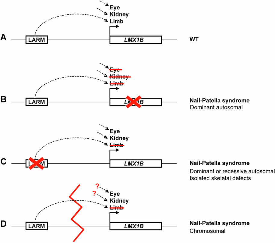 C. Forme du syndrome nail-patella limitée au squelette, liée à une anomalie des modules autorégulateurs de LMX1B spécifiques du membre (LARM, LMX1B Limb AutoRegulatory Modules).